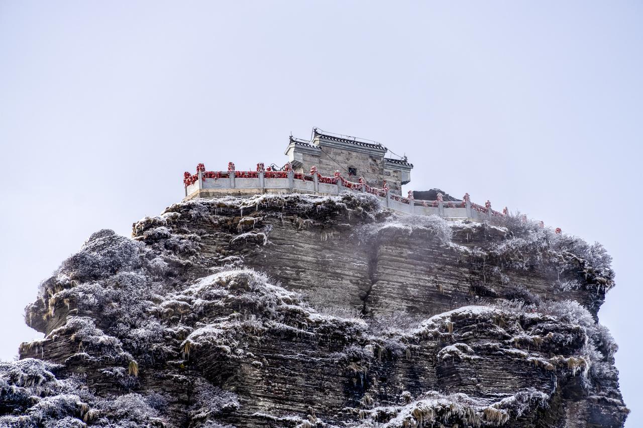 冬季的梵净山直接美成水墨画,银装素裹的峰峦,红墙古寺,多了份仙气。