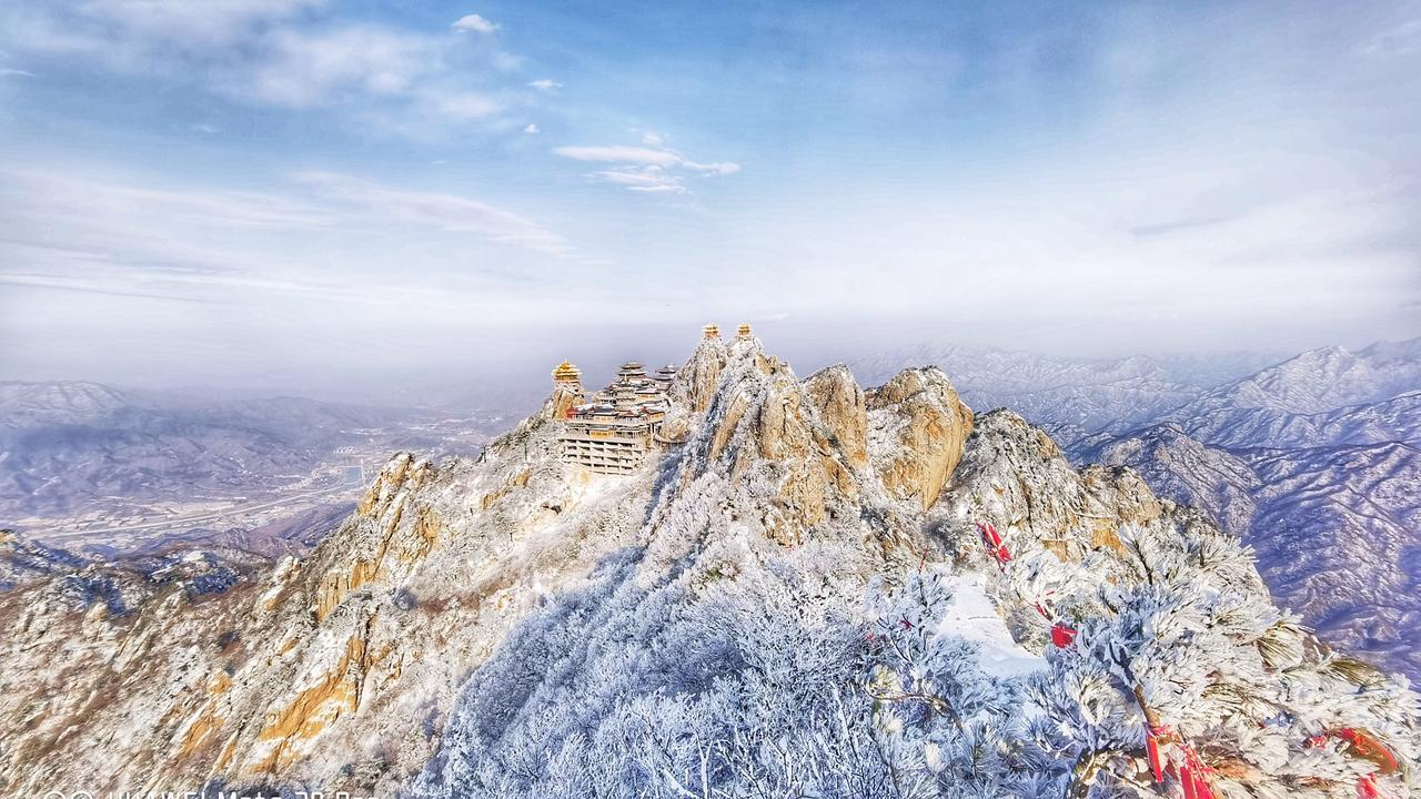 索道穿行在雾凇林里,脚下是千峰堆雪,身旁是晶莹琼枝。普渡广场、承恩寺,朱红寺墙被白雪覆盖,青灰瓦片堆着积雪。蘑菇石在阳光下泛着红晕,红云金顶云雾蒸腾,如梵天净土。